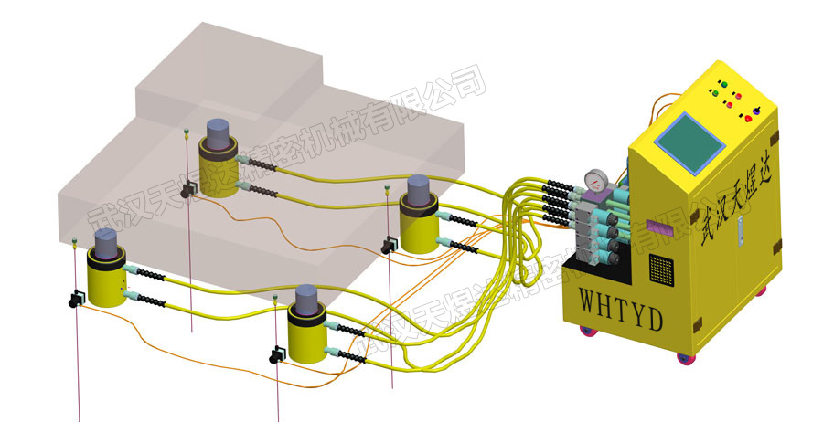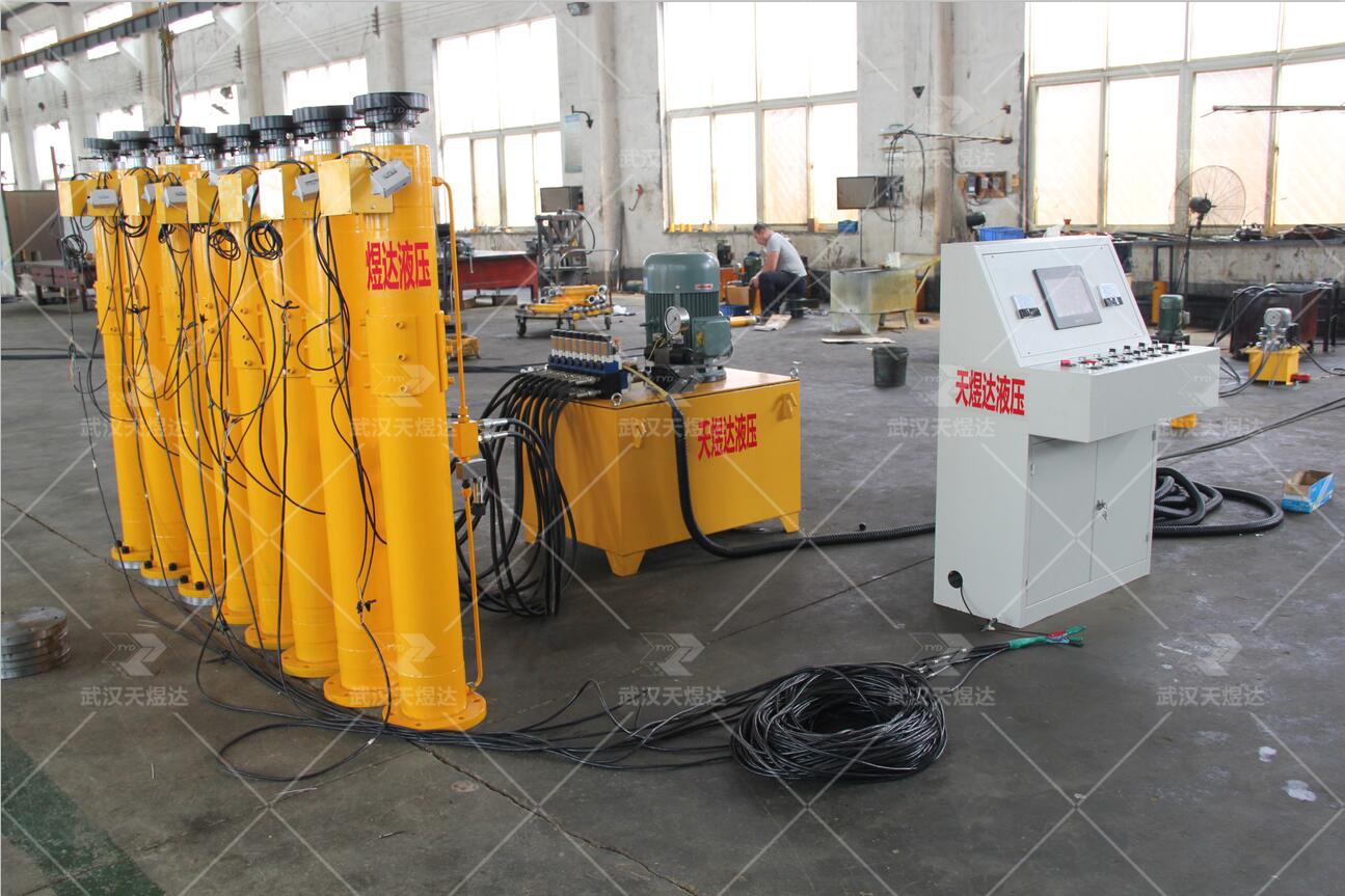 依据位移传感器和压力传感器反应数据到PLC控制设备,通过人机操作界面设定PLC电脑,从而PLC计算机自动操控电动液压泵站和千斤顶,从而对各种大型、重型的重物起、降和定位,使用于重量分部不均的重物。